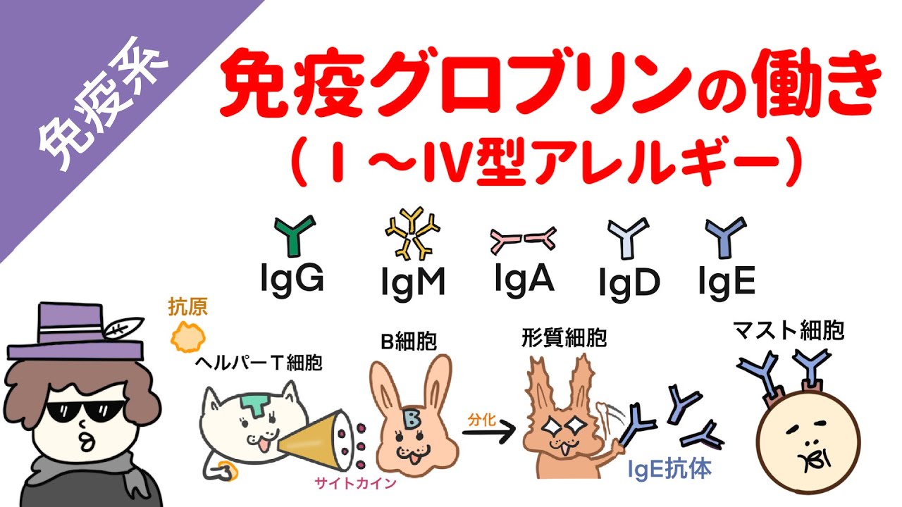 免疫グロブリンの働き 1型、2型、3型、4型アレルギーの機序。