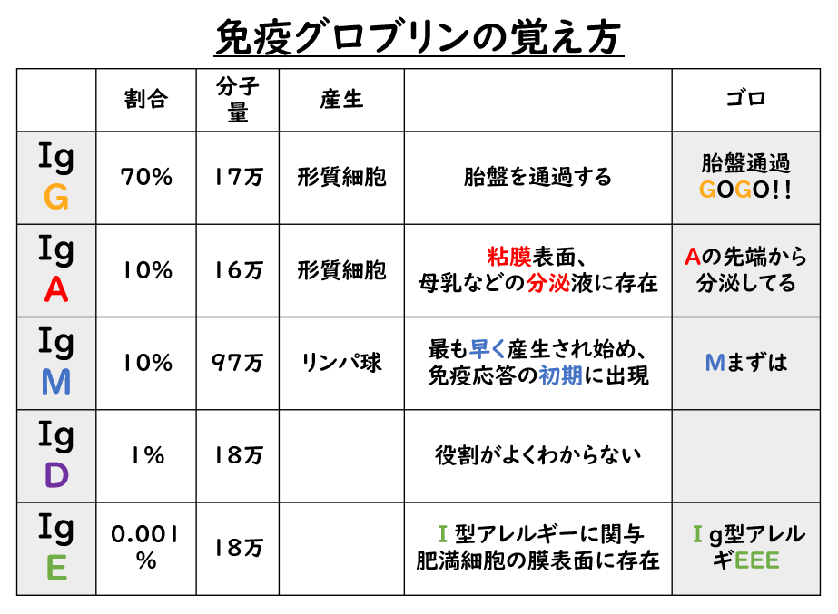 免疫グロブリン IgG IgM IgA IgE 特徴 覚え方 語呂合わせ*看護国試ゴロ*看護師国家試験対策 絶対合格するぞ。