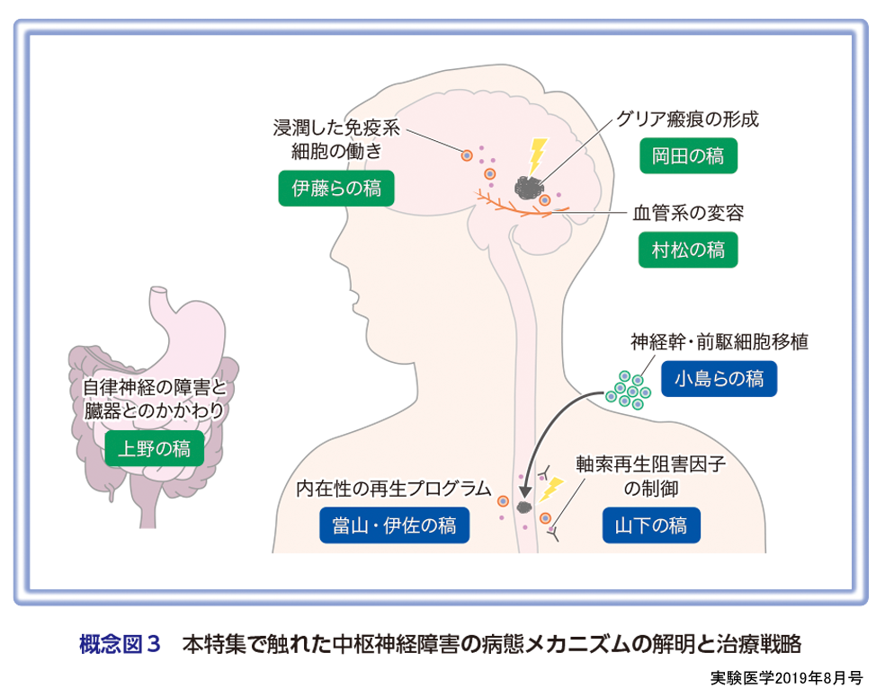 実験医学:最も修復しにくい臓器 中枢神経を再生せよ!〜炎症・グリア・臓器の連環が織りなすメカニズムから機能回復に挑む - 羊土社。