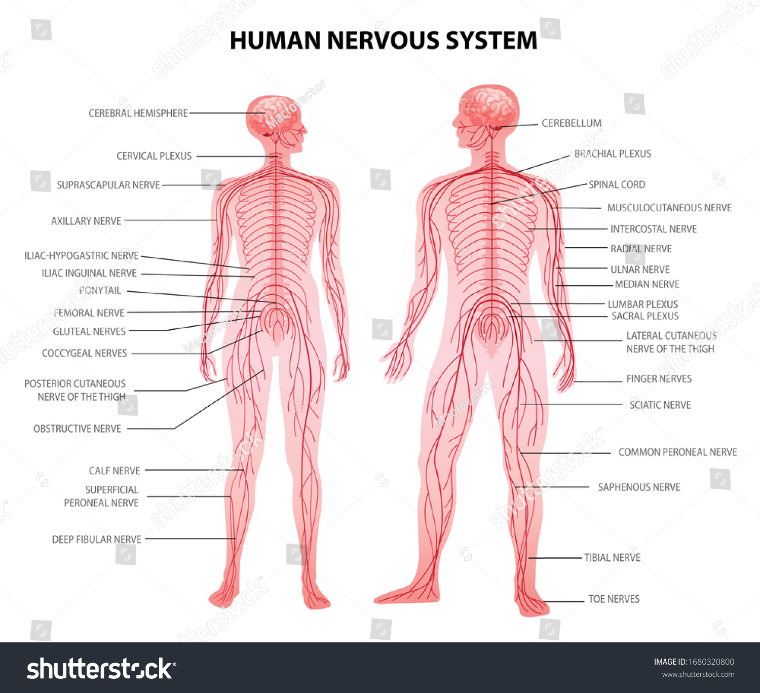 人間の男性の体の中枢と末梢神経系の現実的な生理学的生理教育図の解剖学用語ベクターイラスト」のベクター画像素材 ロイヤリティフリー1680320800Shutterstock。