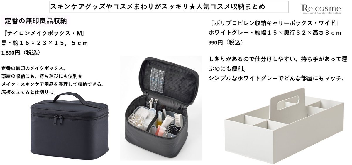 Re:cosme アールイーコスメ公式 がんばる女子の美肌計画 on X: "コスメをスッキリ収納アイテムまとめ❣ \人気無印良品☆ ナイロンメイクボックス¥1890 ☆キャリーボックス¥990 \ ニトリ も◎☆コスメトレー¥1247 \収納テク☆名刺フォルダにサンプル☆ウォール。