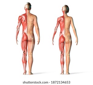 男性と女性の筋肉と骨格系の背面図。 白い背景に全体の人物。」のイラスト素材 1872134653Shutterstock。
