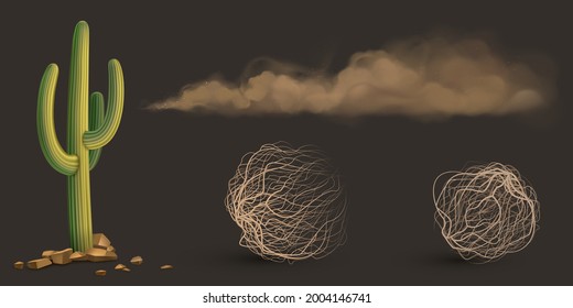 グレイの背景にサボテン、茶色のちり雲とタンブルウィード、乾いた雑草のボール。流砂、緑の砂漠の植物、転がる枯れた茂み、古いタンブル草のプレーリーのベクター画像のリアルなセット」のベクター画像素材 ロイヤリティフリー2004146741Shutterstock。