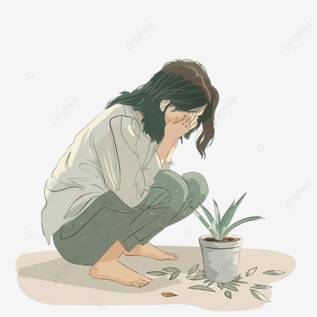 ポットの枯れた植物を見て泣いている女性が地面に葉を残します シンプルなシーン 手描きのイラスト パステルの落ち着いた色 グリーン グレーベージュの色合いイラスト素材透過、PNGフリー画像ダウンロード - Pngtree。