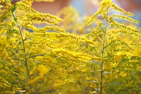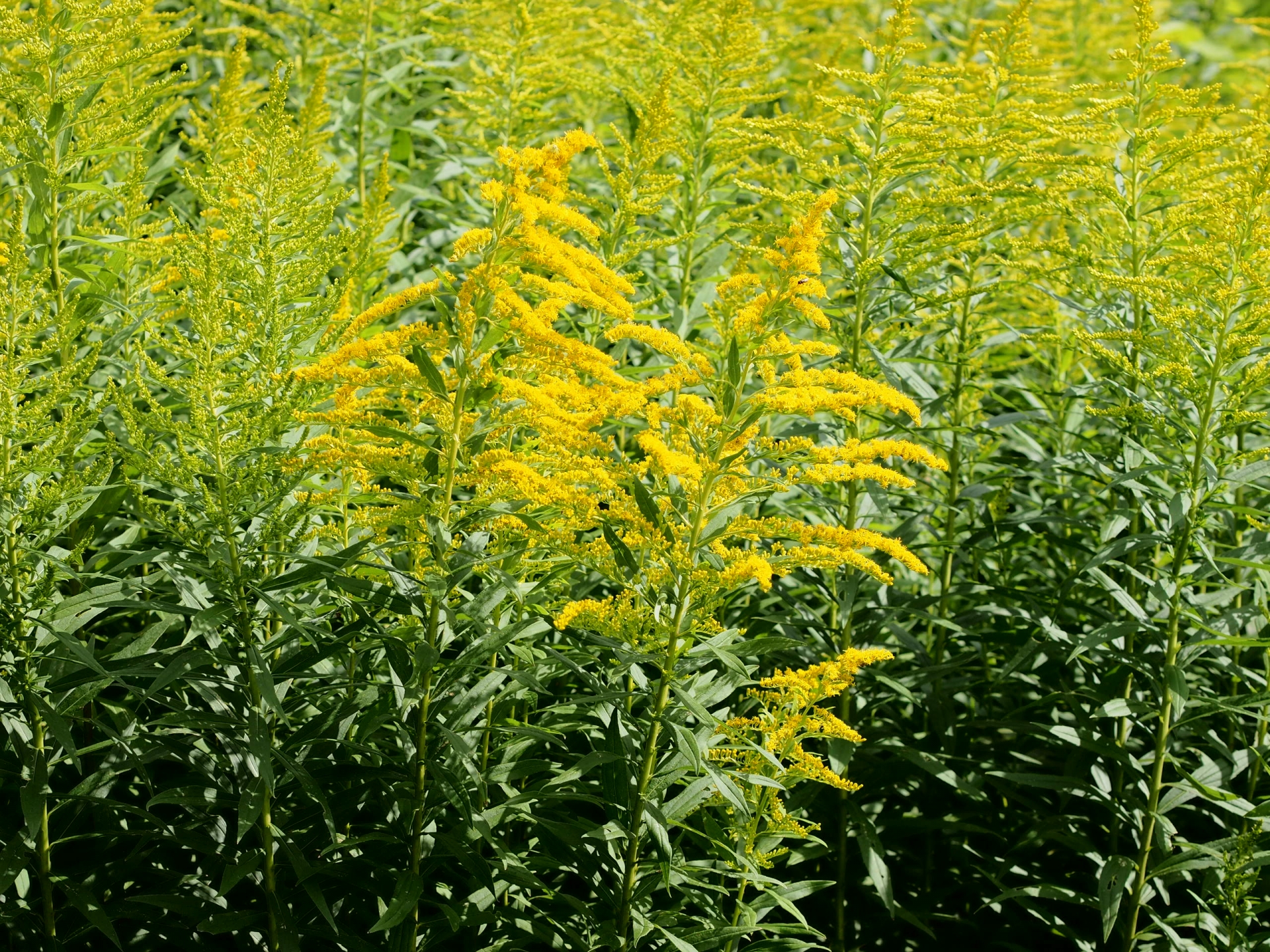 ブタクサと同じ時期に咲くので、秋花粉の原因と濡れ衣を着せられやすい「セイタカアワダチソウ」。この花は虫媒体で花粉を運ぶので、花粉を風に乗せて飛ばすわけじゃないんです。 ですが、季節的に花粉症の原因だと思われがち。 綺麗な黄色い花なのに。セイタカアワダチ。