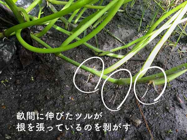サツマイモの「つる返し」は、芋を太らせるための大事な作業。