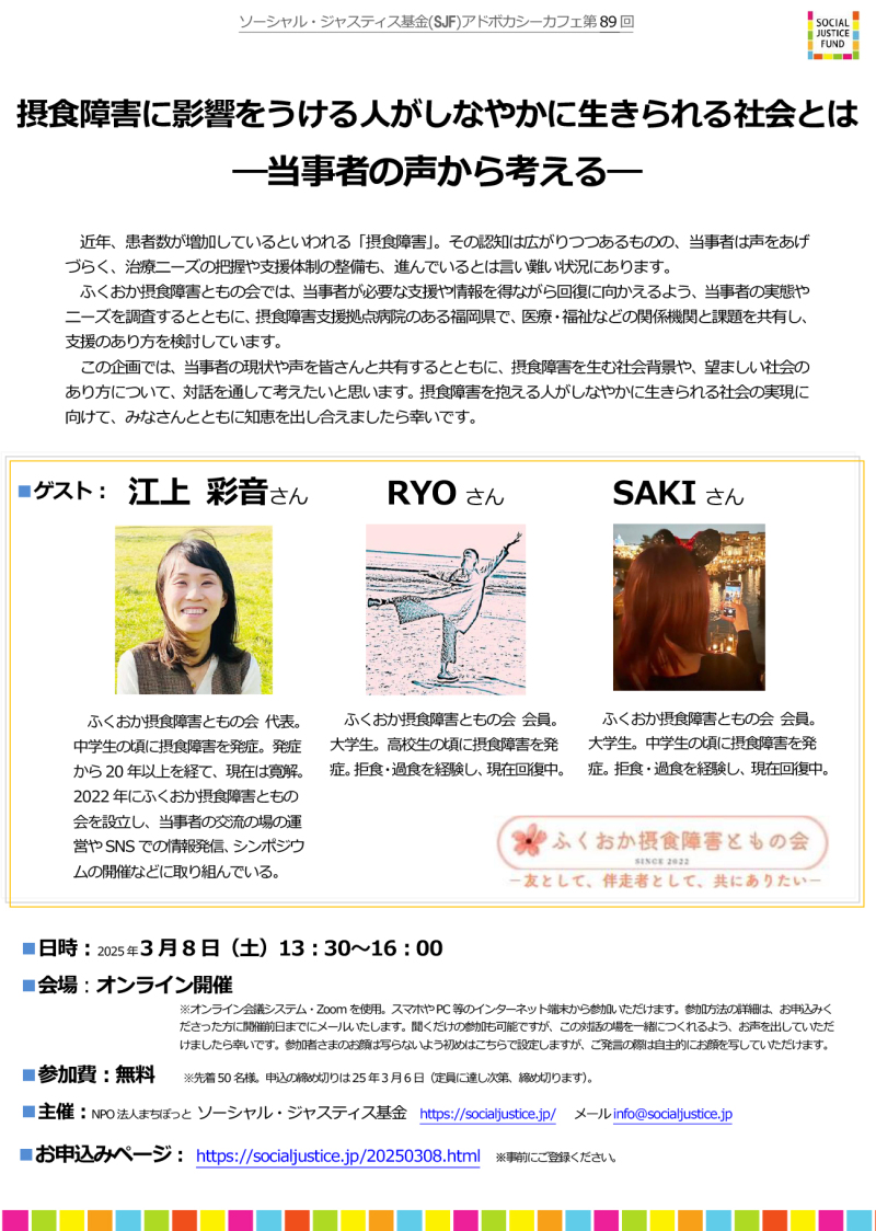 摂食障害に影響をうける人がしなやかに生きられる社会とは ―当事者の声から考える―』SJFアドボカシーカフェ第89回ボランティア・市民活動の総合情報サイト「ボラ市民ウェブ」。