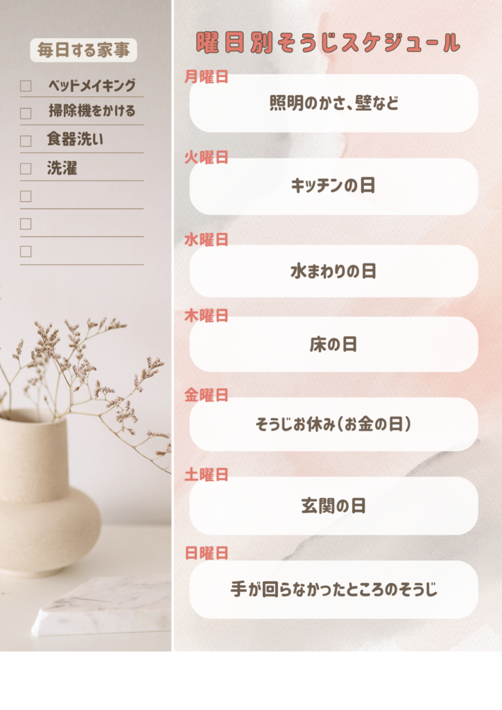曜日別掃除スケジュールで毎日の家事負担を軽く!忘れっぽい人におすすめくうかんしんぷるライフ。