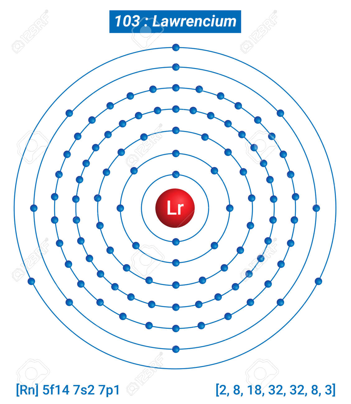 Lrローレンシウム元素情報 - 事実、特性、傾向、用途および比較元素の周期表、ローレンシウムの殻構造 -エネルギー準位あたりの電子のイラスト素材・ベクター Image 188951991。