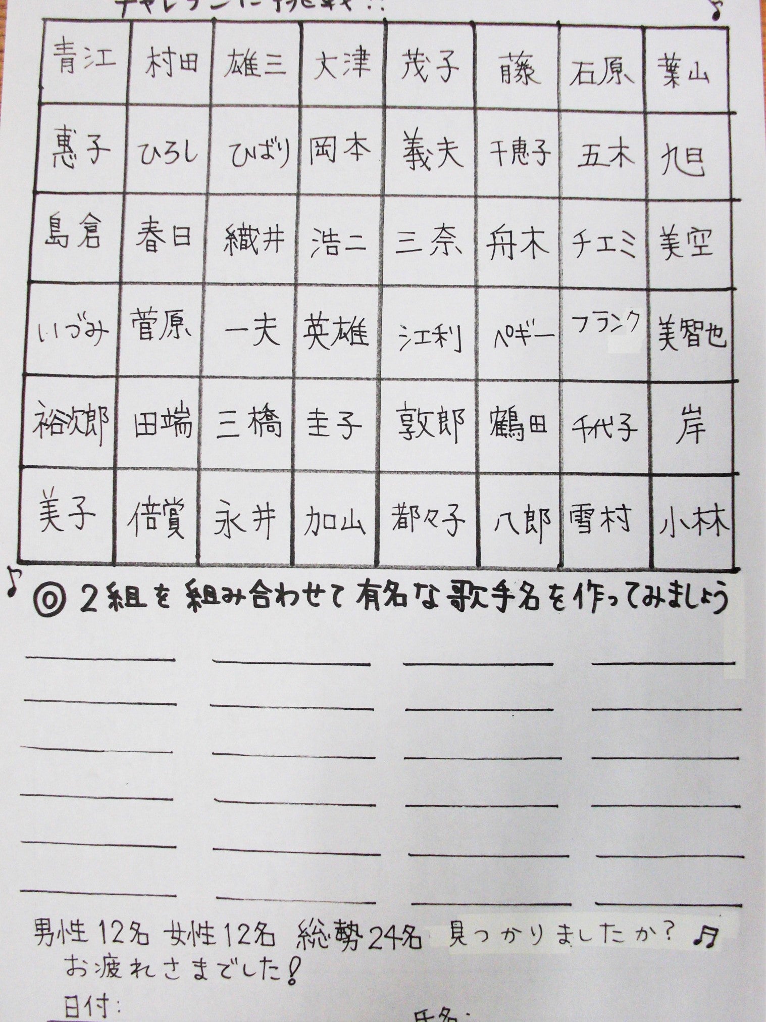 歌手名クイズ☆脳トレ無料プリント 高齢者・介護・認知症予防に心のリハビリセンター職員のつれづれ日記 長崎の心療内科すがさきクリニックデイケアです。