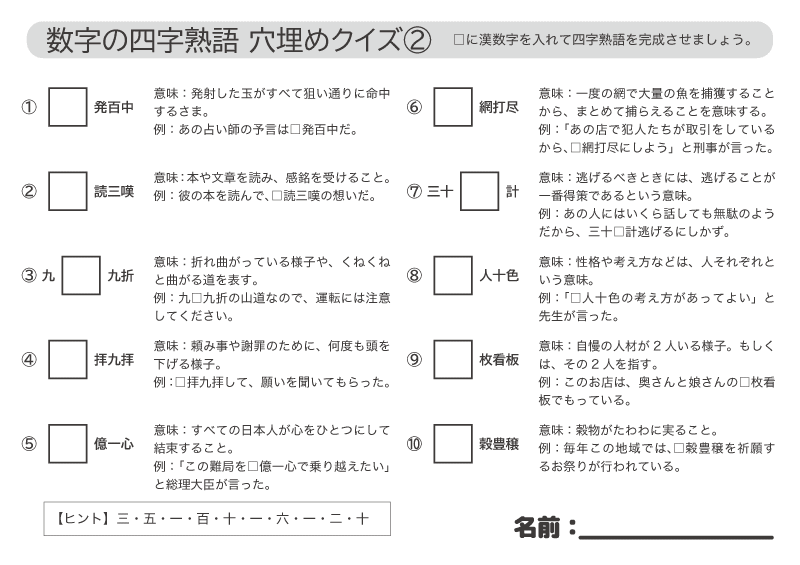 四字熟語クイズ25問 数字を入れるだけ!穴埋めクイズで高齢者の脳トレハートページナビ。