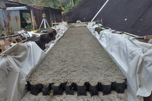 道路改良現場グランドセルマットレス工法紹介その2!まあるい区画の中に砕石投入と締固!下段上段と2段施工です!この後ベースコンクリート、型枠組立と続きます #建設サービス業 #有限会社田村土建 #豊岡市日高町 #グランドセルマットレス工法 #軟弱地盤対策。