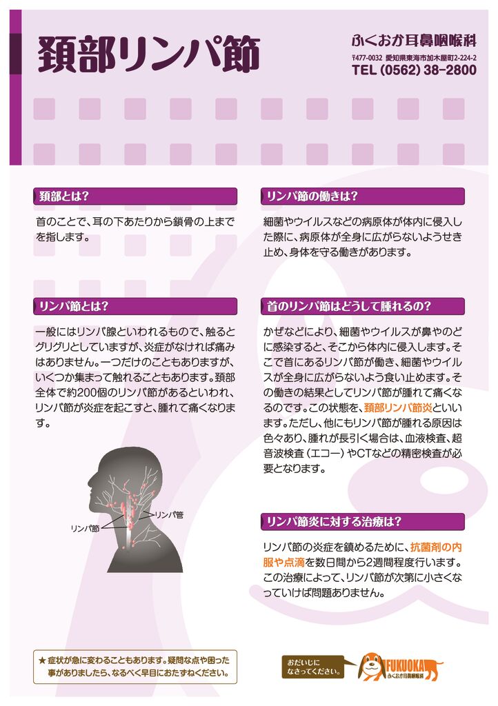 頚部リンパ節 -愛知県東海市の耳鼻科ふくおか耳鼻咽喉科耳・鼻・のど、いびき 無呼吸症候群 、アレルギー検査、花粉症なら耳鼻科専門クリニックにお任せください。