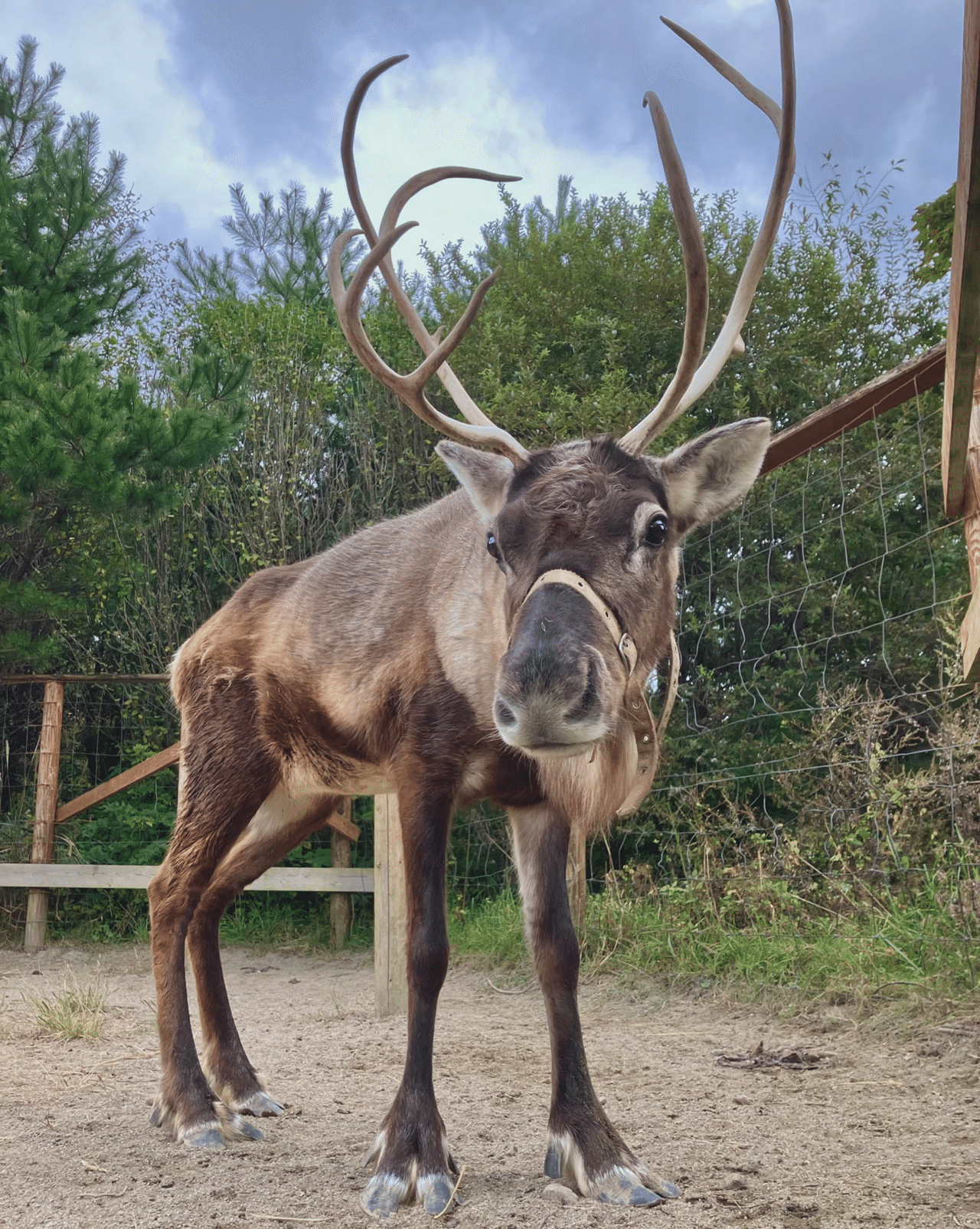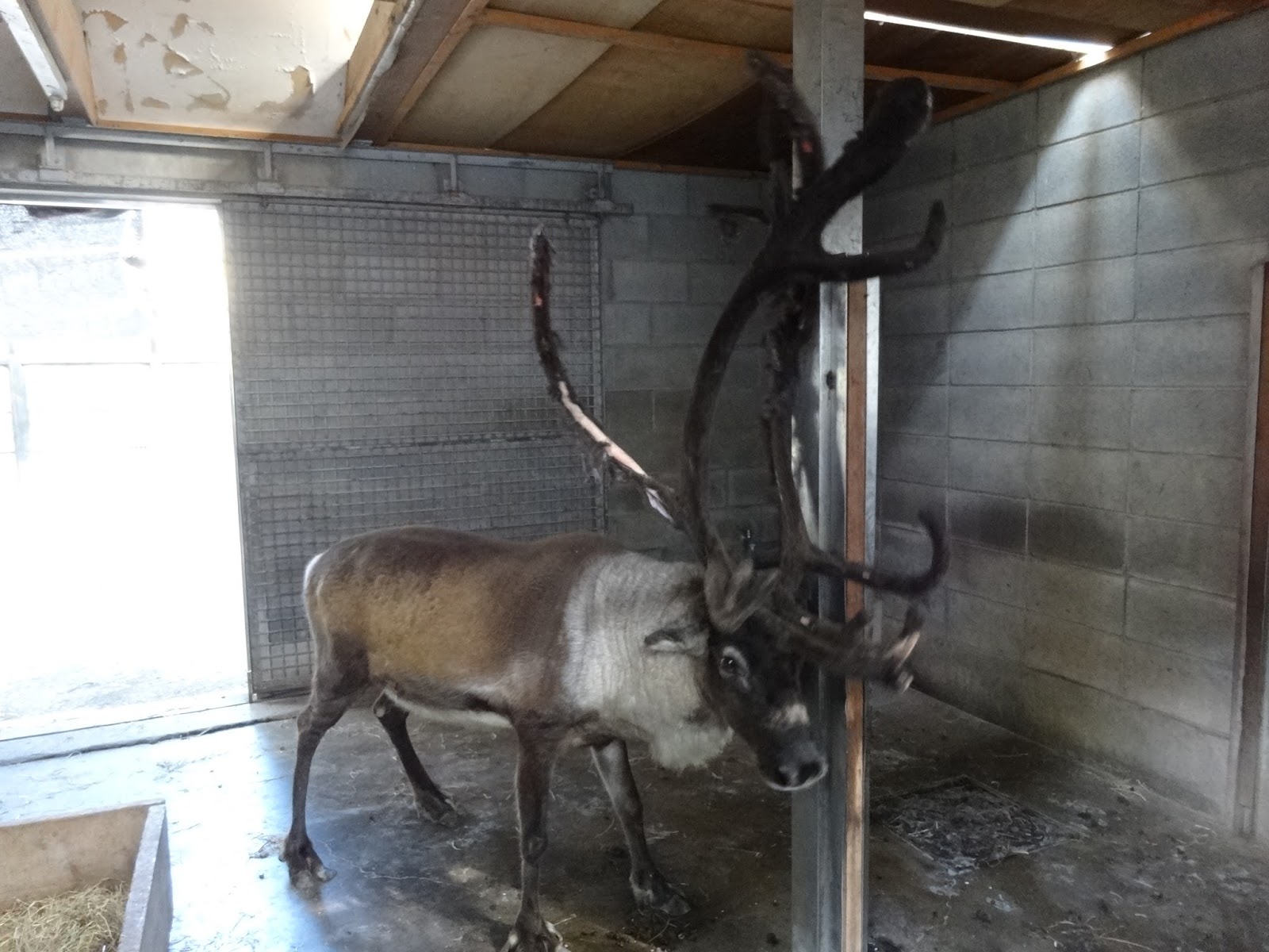 トナカイのデナリ、ツノの皮がむけました! 昨日まではふさふさの袋角でしたが、今朝見に行くと一気に皮がむけていました。繁殖期を迎える準備が着々と進んでいるようです。旭山動物園asahiyamazooトナカイreindeerデナリ。