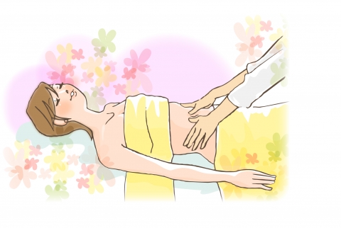 エステでお腹の贅肉をもみほぐしてもらっている女性のイラスト - 無料イラストのIMT 商用OK、加工OK。