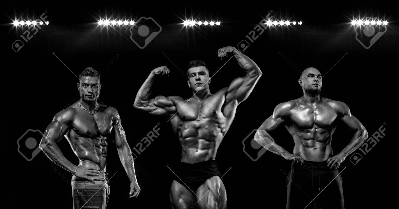 スポーツの壁紙とモチベーションの概念。黒の背景にジムで強力な運動ボディービルダー.フィットネスとボディービルの栄養広告ポスター。の写真素材・画像素材Image 124438826。