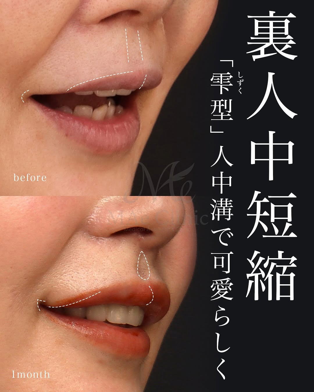 しずく型人中溝で可愛らしく」 裏側人中短縮 傷の見えない人中短縮 、人中厚み調整3D、人中窩形成術、口角挙上 術後1ヵ月MAeClinic マエクリ。