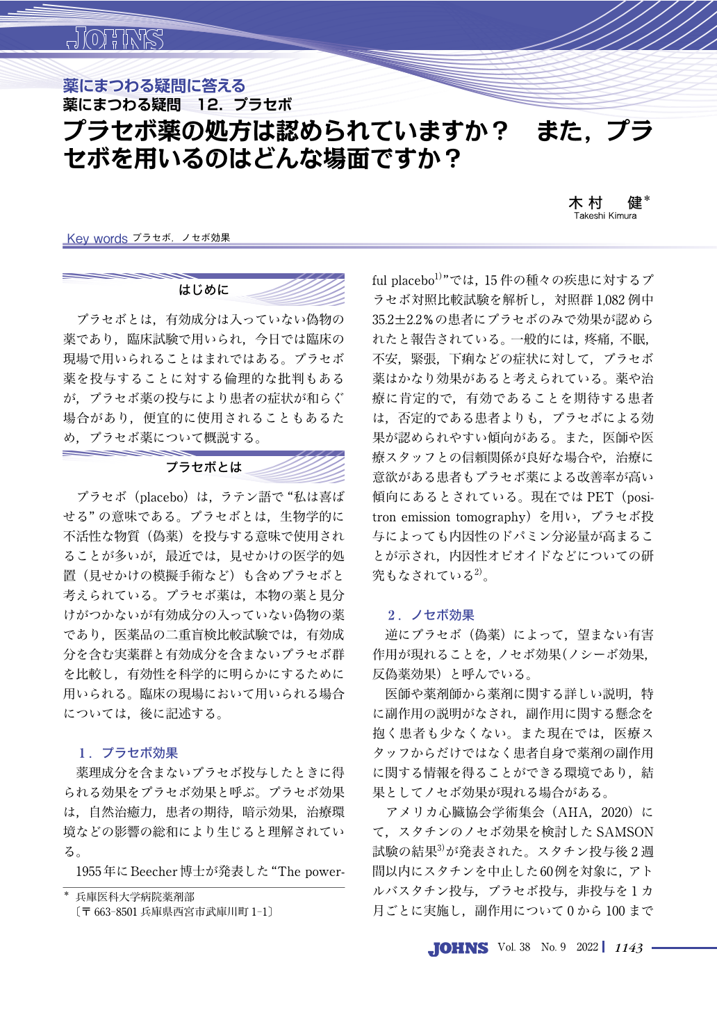 プラセボ薬の処方は認められていますか? また,プラセボを用いるのはどんな場面ですか?JOHNS 38巻9号医書.jp。