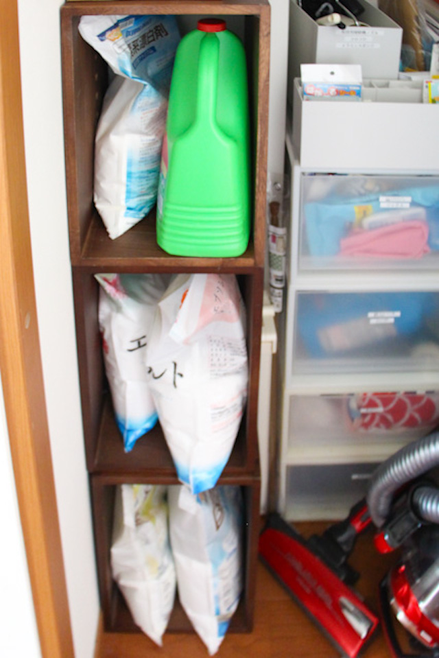 意外と置き場所に悩む「詰め替え洗剤」のストック、正解がセリアにありました!サンキュ。