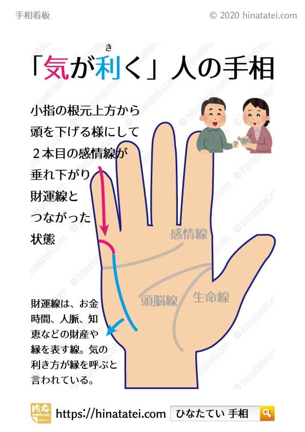 財運線「財運線」とは、小指の下あたり 感情線の上 に現れる線のことで、お金の巡りや財運の強さを示します。 特に、財運線がはっきりと現れている人は、経済的な成功をつかみやすいといわれています・ くっきりと長く伸びた財運線 → お金を引き寄せやすく、大きな。