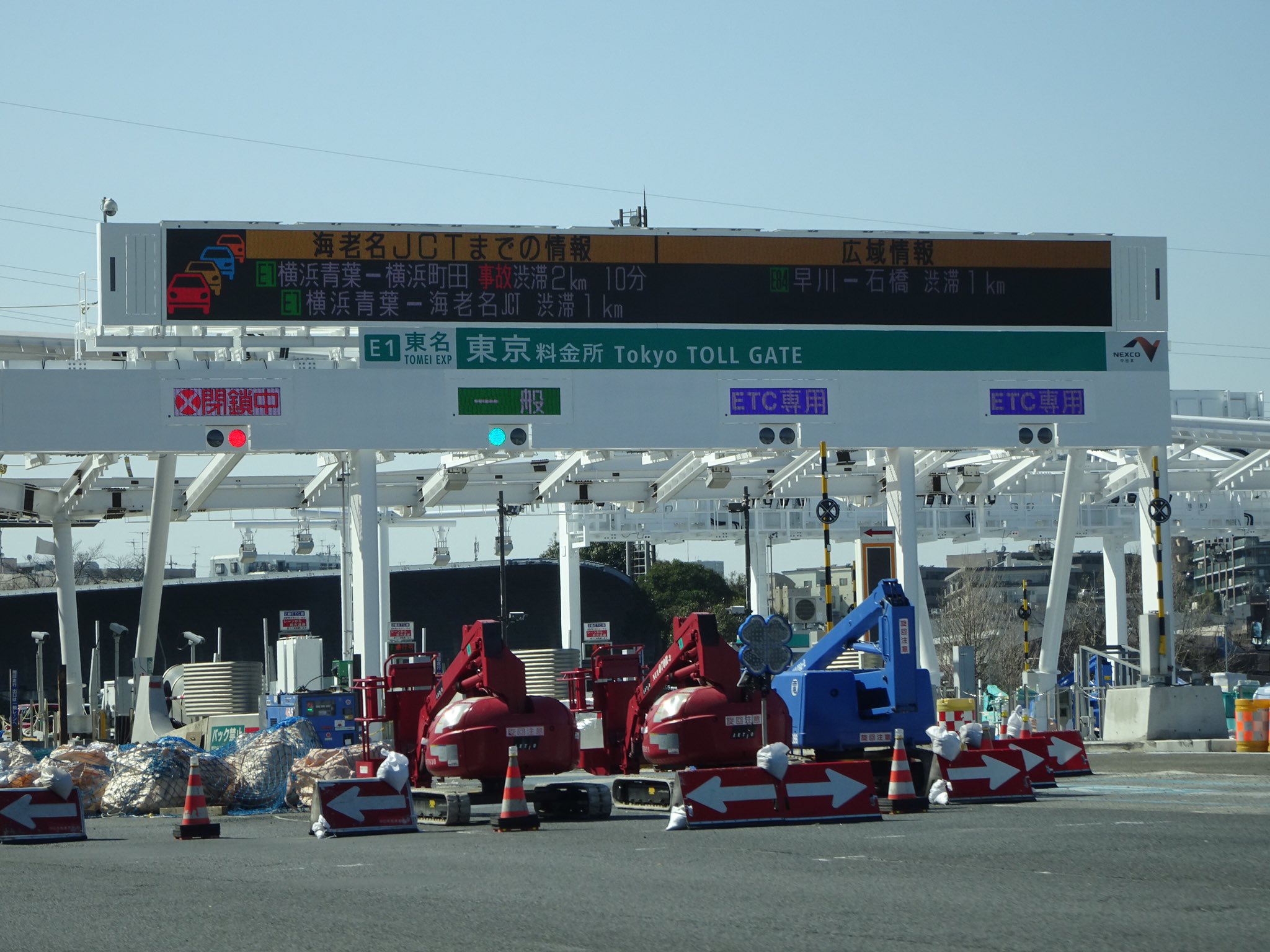 いわたび on X: "東名高速 東京料金所 リニューアル工事中 。白色を基調としたデザインで明るく清潔感があります *^^*横長の迫力ある巨大情報板が設置され、下り線では海老名JCTまでの情報と広域情報で分けて表示されており、上り線ではETCレーン運用案内がなされてい。