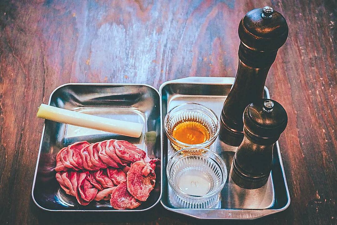 豚タン刺し低温調理でタンの食感をいかした調理方で仕上げてある豚タンです‼️静岡市 駅近く チカッパ 肉巻き 野菜串 喫煙可 日本酒 豚タン。