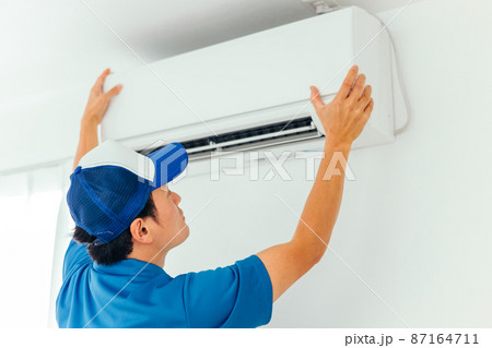 エアコンの清掃をするハウスクリーニングの男性作業員の写真素材77206697- PIXTA。