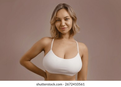柔らかい白い下着に曲線的で官能的な姿を示す美しい金髪の女性。健康な肌、セクシーなバストと自信を持って態度。健康、ボディケア、女性らしさ。写真素材2672410561Shutterstock。