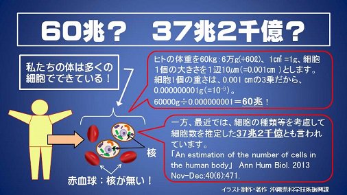 沖縄県庁科学技術振興課 on X: " あなたの細胞、いくつ?私たちの身体は細胞のかたまりです💪 では、その数いくつだと思いますか?実は、これ諸説あるのです。代表的な2つを挙げましょう。細胞の平均的な体積から推定した60兆個。細胞の種類等を考慮した37兆2000億。