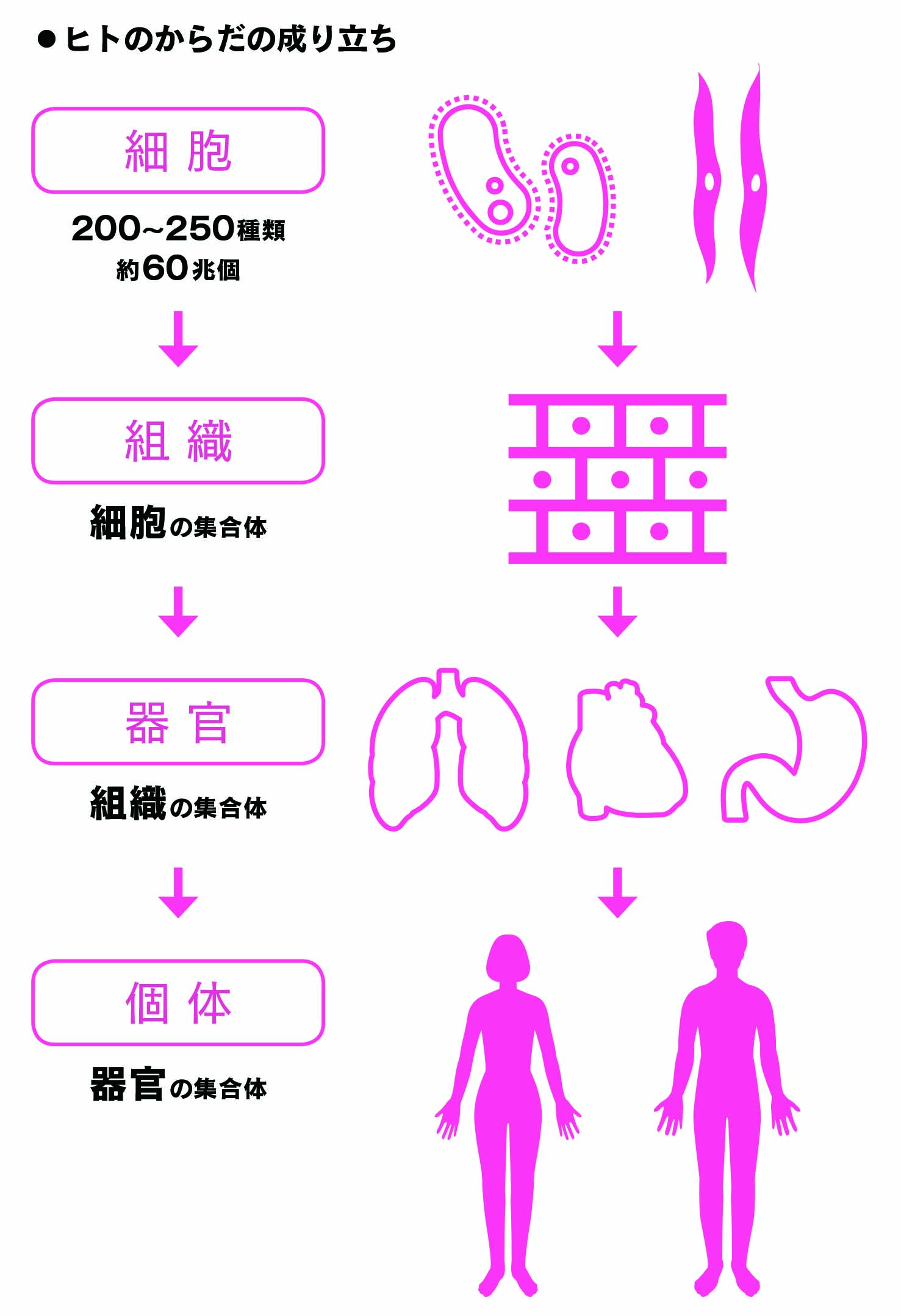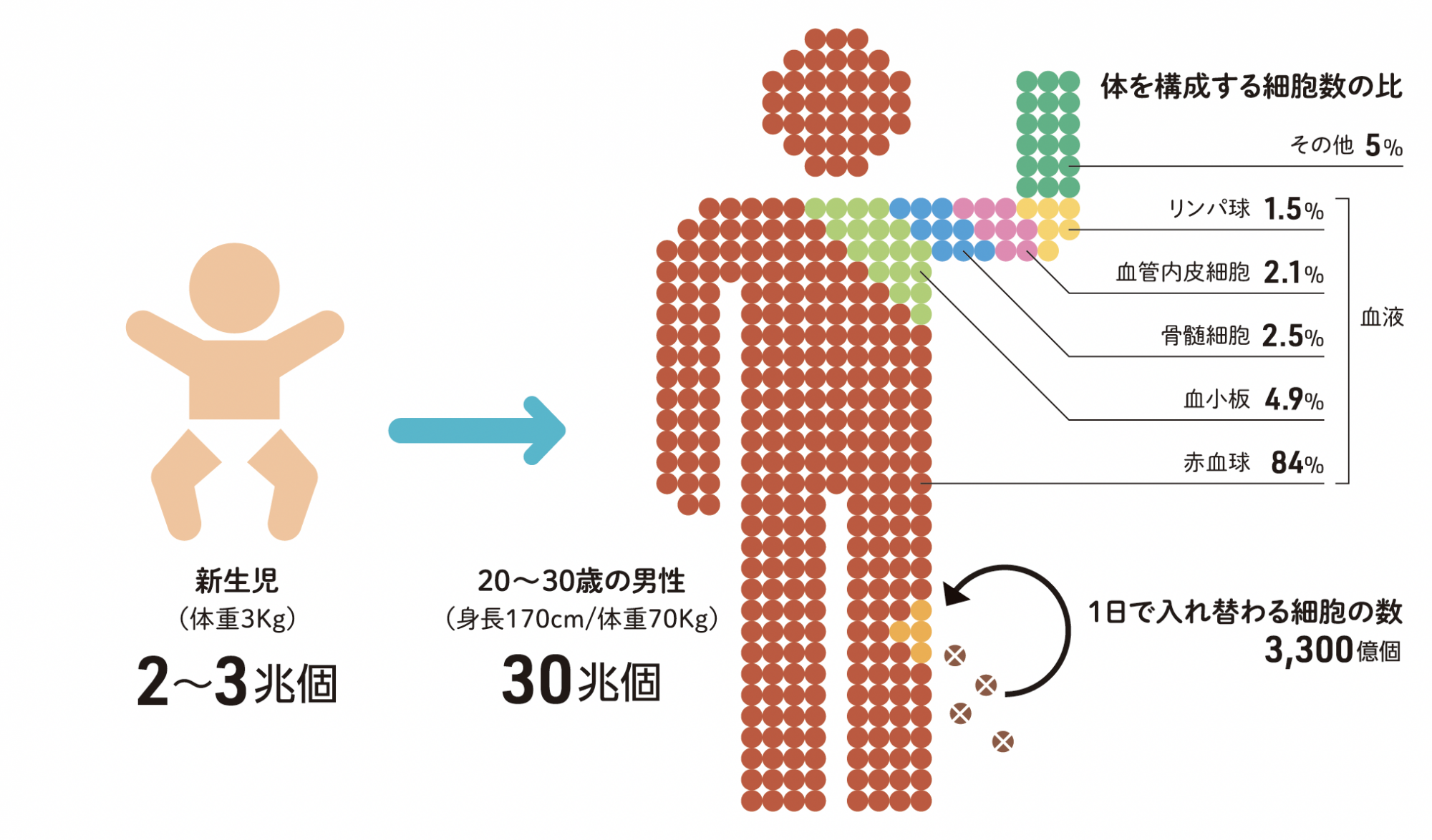ヒトを構成する細胞の数私たちの身体はたった1つの受精卵から始まり、細胞分裂を繰り返しながら様々な機能をもつ細胞へと分化していきました。成人は約60兆の細胞から構成されます。最近では約36兆といわれていますかずひろ先生の解剖生理メルマガ💡国試。