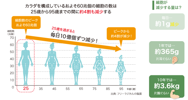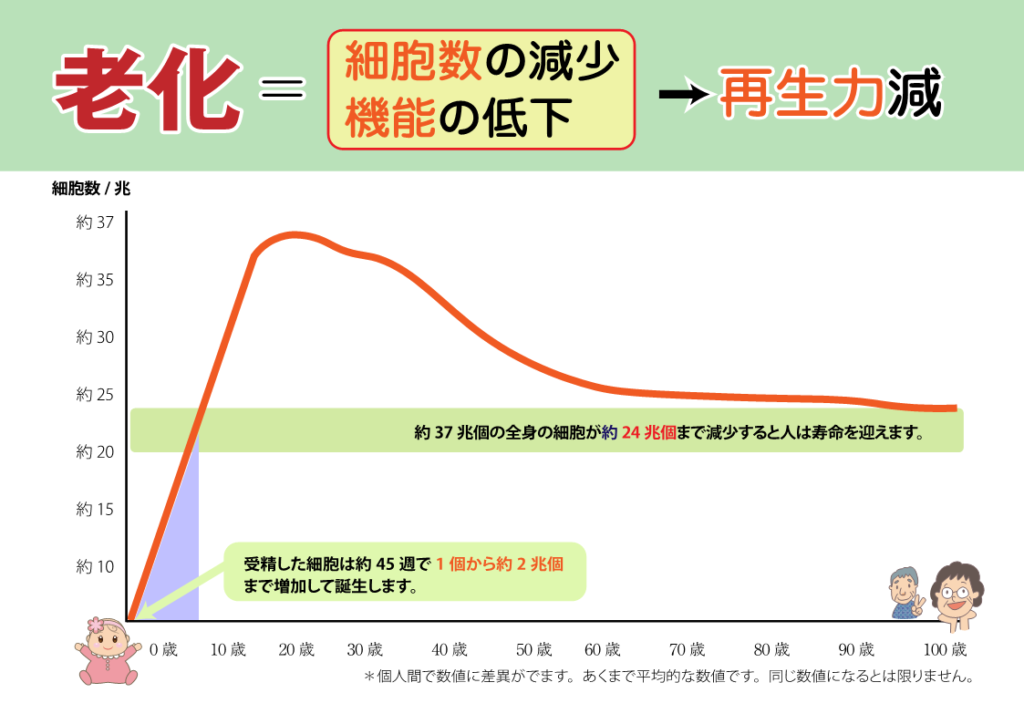年齢ごとの人の幹細胞の数について解説国際幹細胞普及機構。