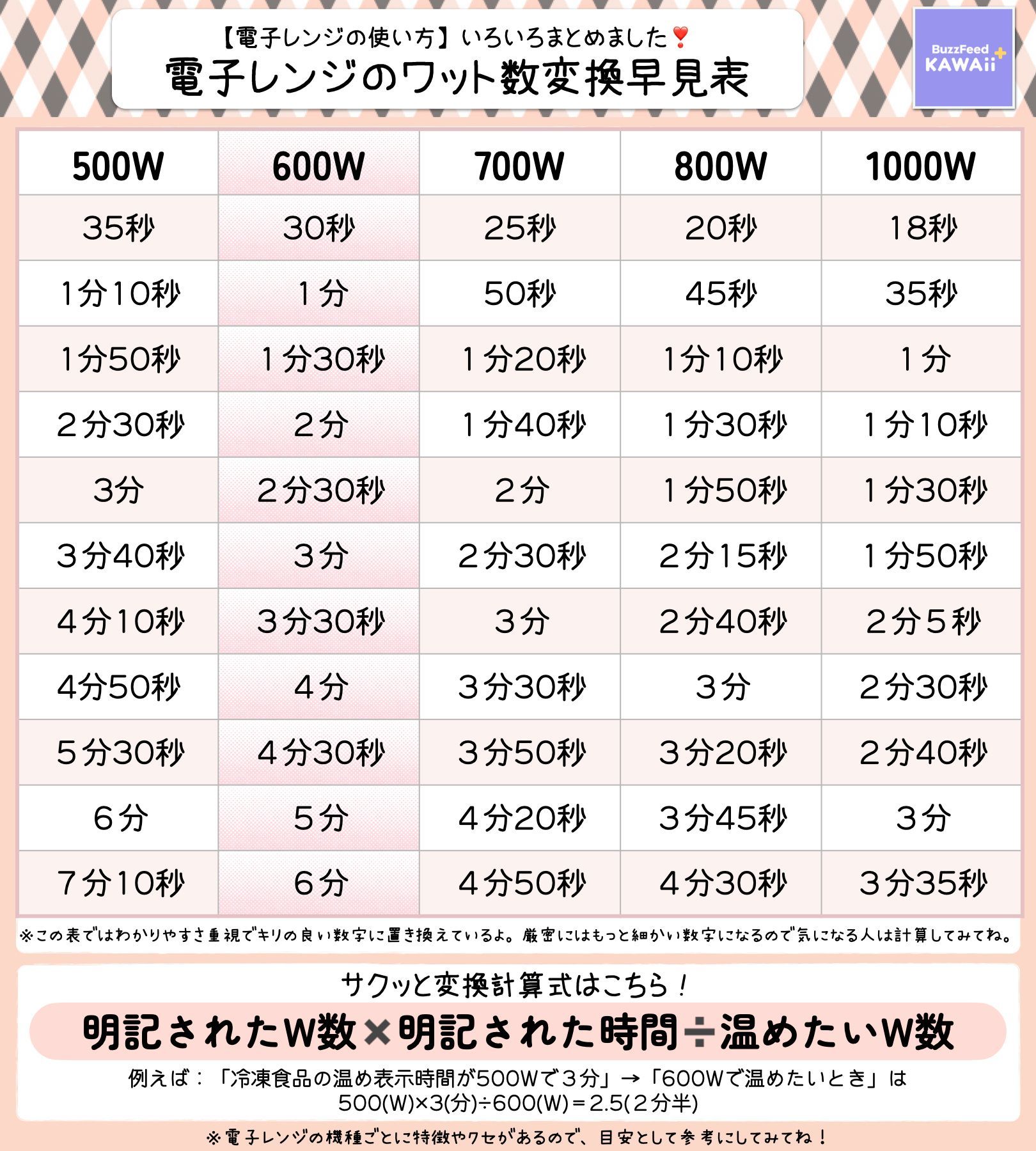 BuzzFeedKawaiiぷらす🌟 on X: "レンジで500Wを600Wでチンしたい、そんな時‼️ ワット数変換表があると便利だよ📝✨基本の使い方も要チェック👀💡 https:t.co 7yUtsZQ1iw"X。