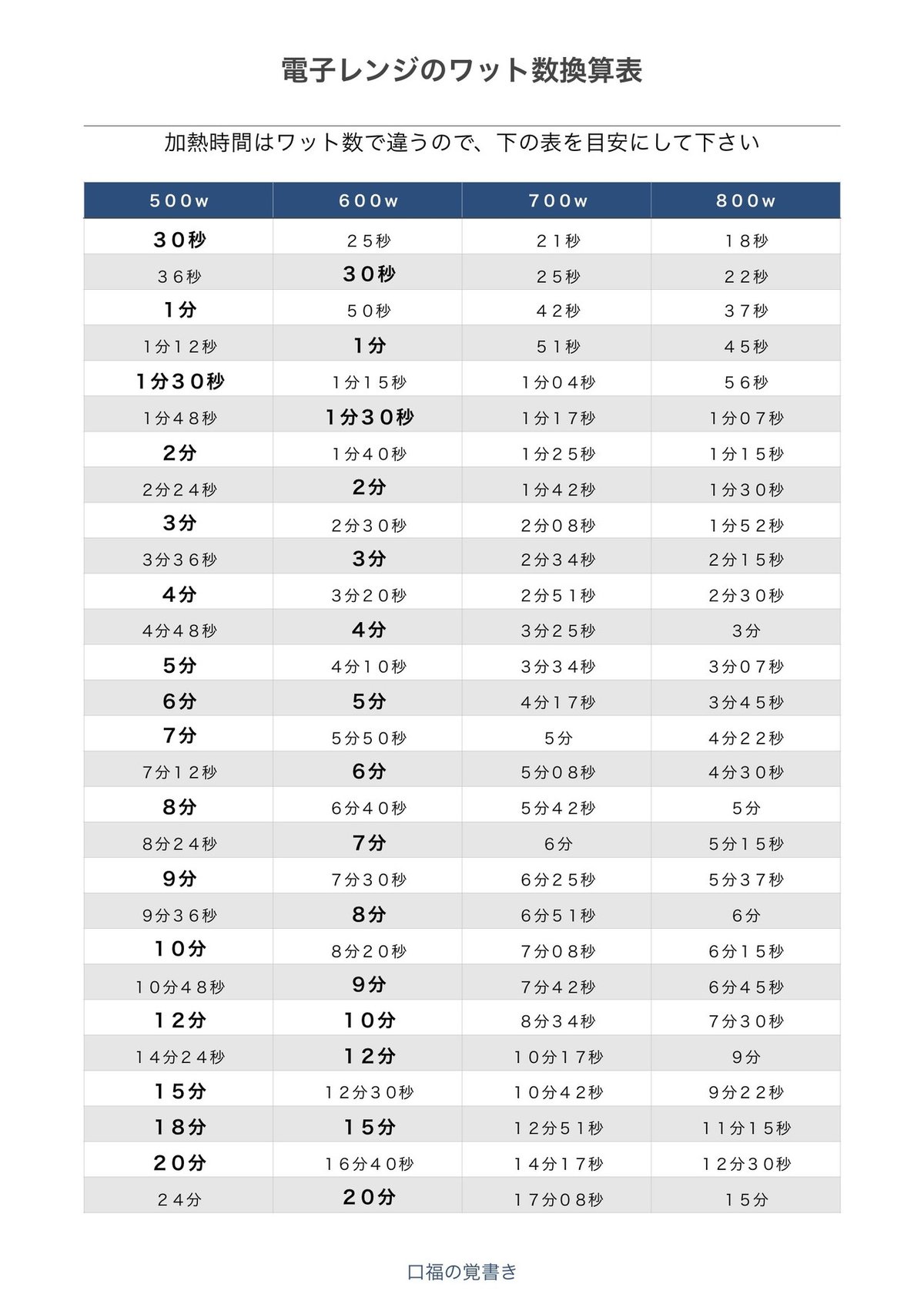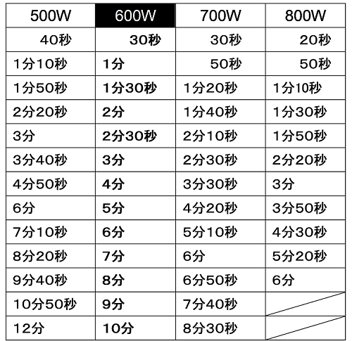 電子レンジ 700Wの加熱時間の早見表 換算:500W・600W・1000W。