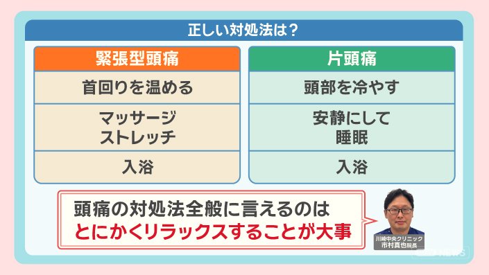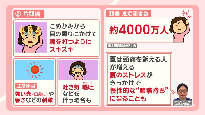 酷暑で悪化“夏の頭痛”その対処法 実は逆効果!?プロ直伝 痛み別の正しい対処法 テレビ朝日系 ANN- Yahoo!ニュース。