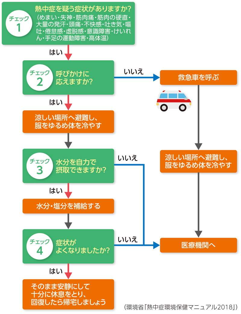 熱中症の初期症状、熱中症の手当 応急処置 について。頭痛や脱水は要注意です。対策方法も。健診会東京メディカルクリニック。
