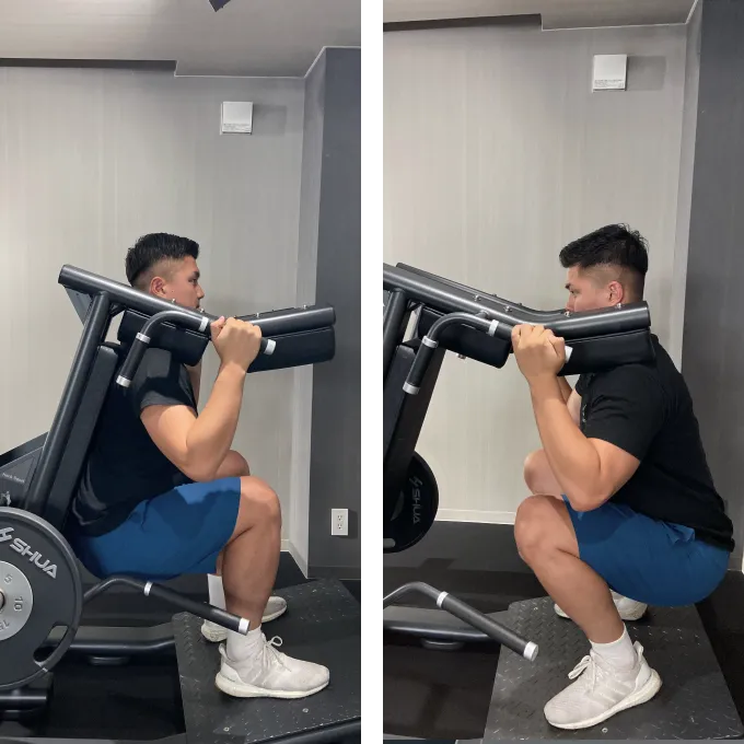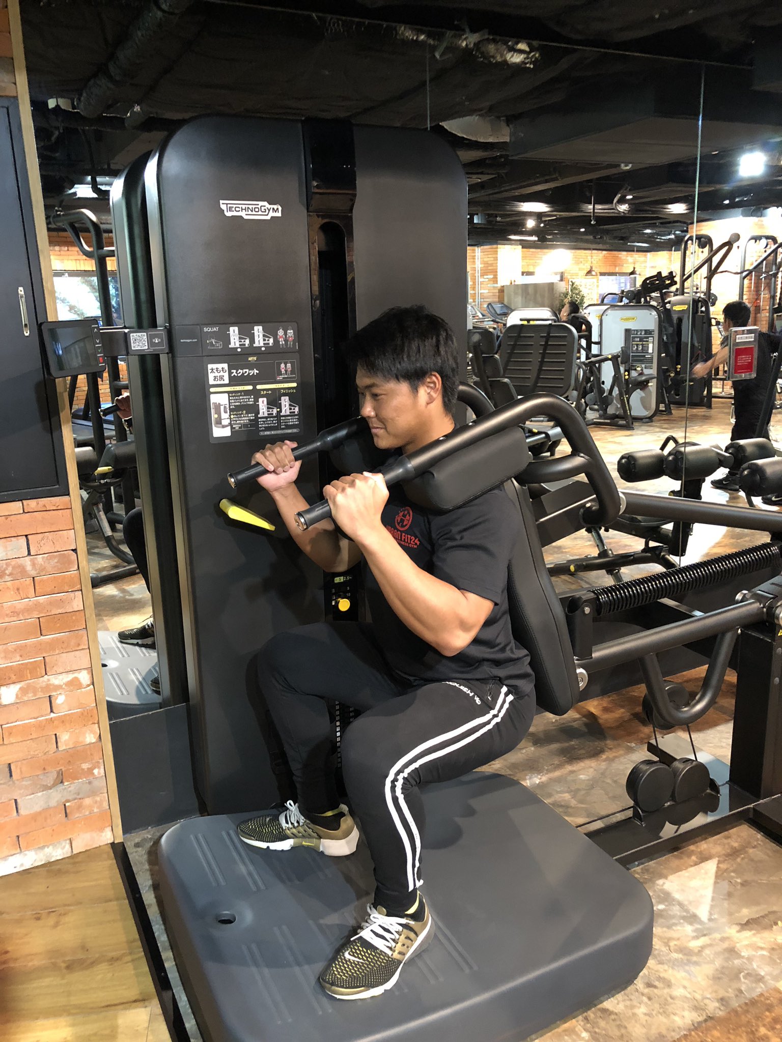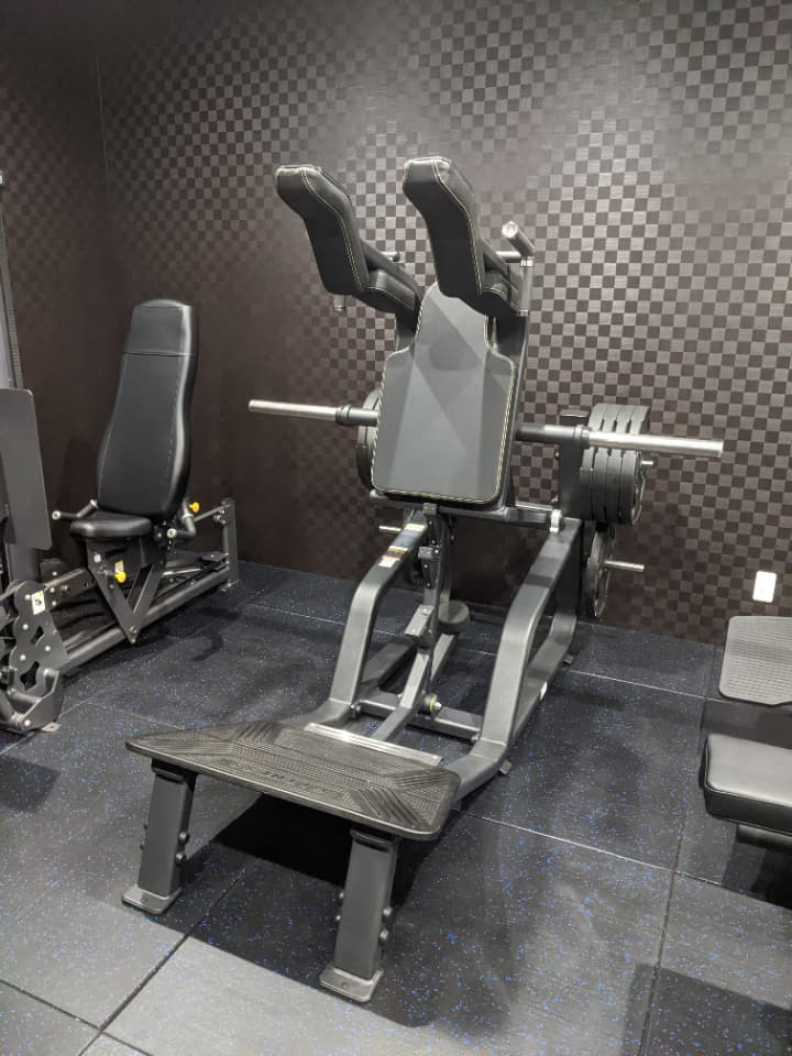 マシン紹介, Cybex ハックスクワットをご紹介します。, 博多リバレイン店にはCybex製のハックスクワットマシンがございます。,ハックスクワットマシンは背もたれで背中と殿部が固定されているので軌道がほぼ垂直になり、膝関節の屈曲が大きくなるので大腿四頭筋への刺激が大きいのが特徴的なマシンです。,しっかりと深くしゃがむことができ大腿四頭筋を大きくするには最適なマシンとなります。,。