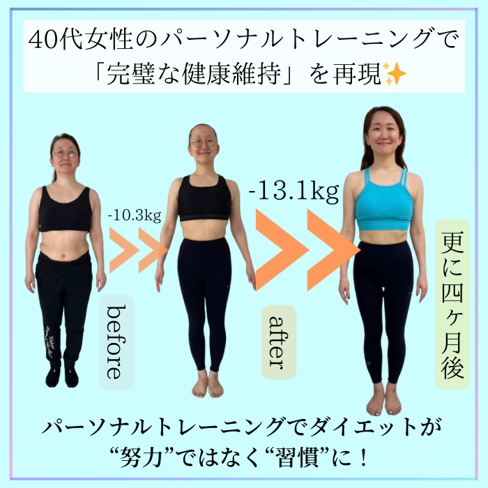 40代が痩せる方法とは!?筋トレでダイエットに成功した40代女性のダイエットのビフォーアフターを参考に解説。