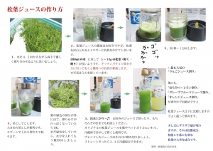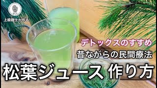 松葉ジュースの作り方 ミルサー編 ・生松葉 約50g ・水 2リットル ① 生松葉の半量 25g と150cc位の水を入れてミルサーにかける 松葉の色が白っぽくなるまでミルサーをまわす② 茶漉しなどで濾しながら、2リットルの水に絞る ③ これを2回繰り返し、松葉ジュースの。