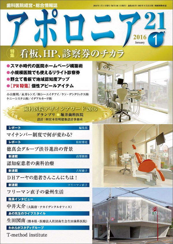 デンタルダイヤモンド4月号弊社代表、雨谷祐之による連載『クリニック改装のデザインソリューション』最新号。 第14回は山崎貴裕先生率いる『やまざき歯科クリニック』にフォーカス。メインテーマは『スタッフが輝く劇場型歯科医院』。課題・患者さんに満足して。