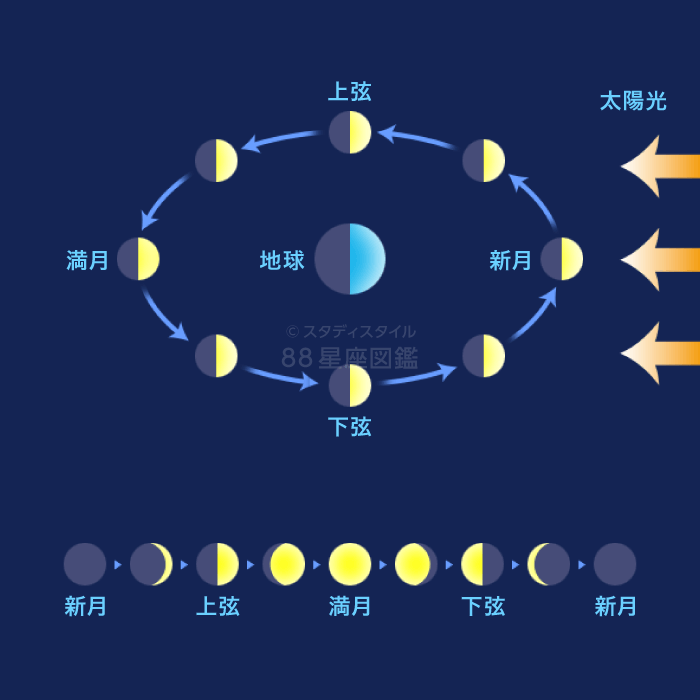 月の満ち欠け しくみ、月相・月齢、月の名前・呼び名 やさしい88星座図鑑。