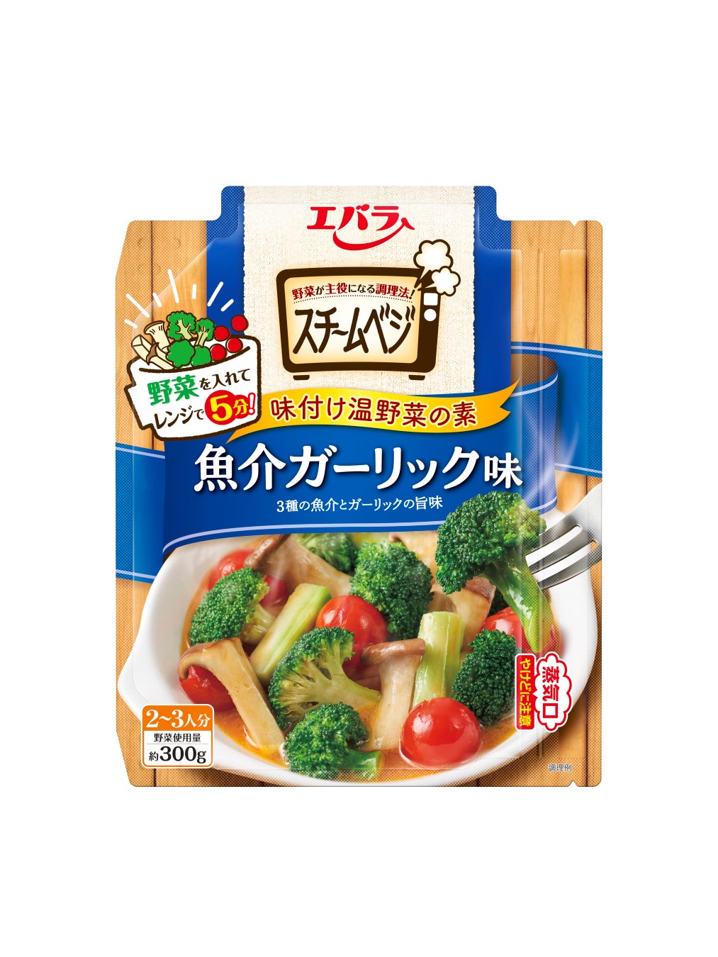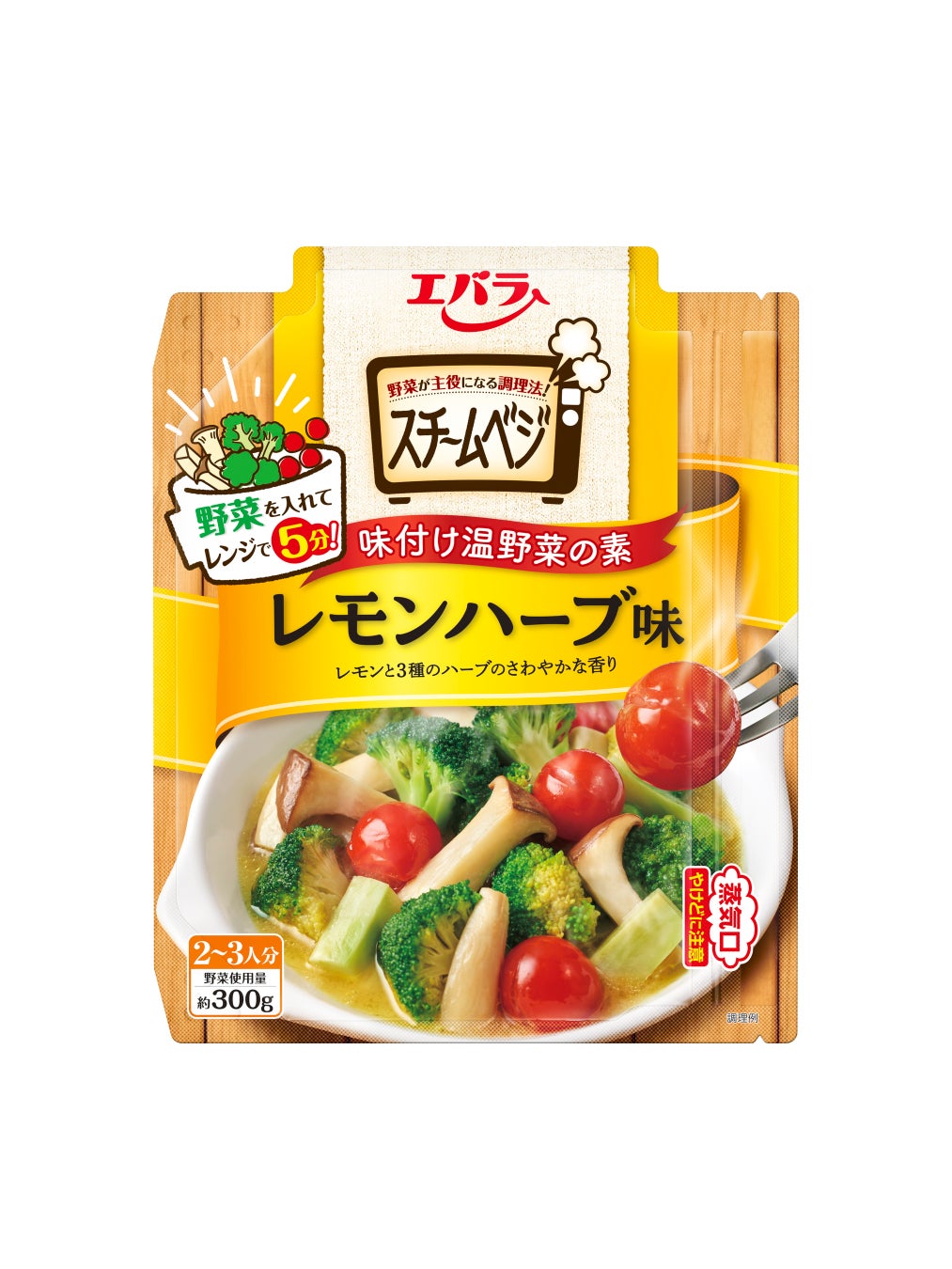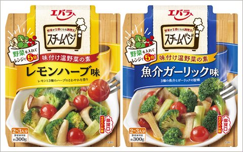 野菜不足の解消に!味付け温野菜の素「スチームベジ」新発売 レンチン5分で野菜300グラムを一度に調理エバラ食品工業株式会社のプレスリリース。