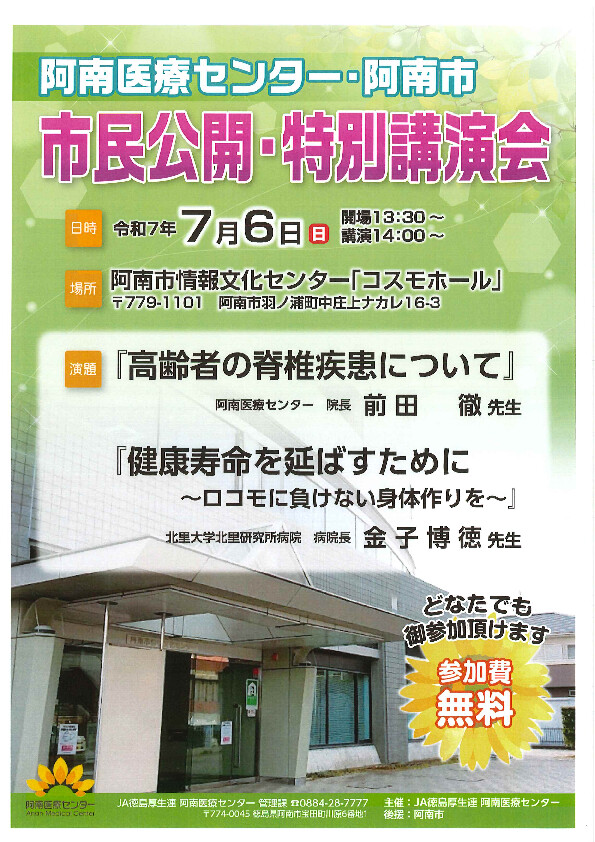 阿南医療センター市民公開特別講座の開催お知らせ – JA徳島厚生連 阿南医療センタ。