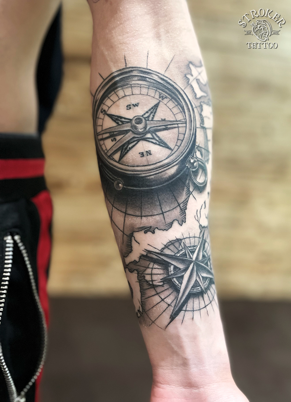 方位磁針 コンパス と矢、世界地図のタトゥー札幌のタトゥースタジオ MOUNTAIN HIGH TATTOO WORKS作品集。
