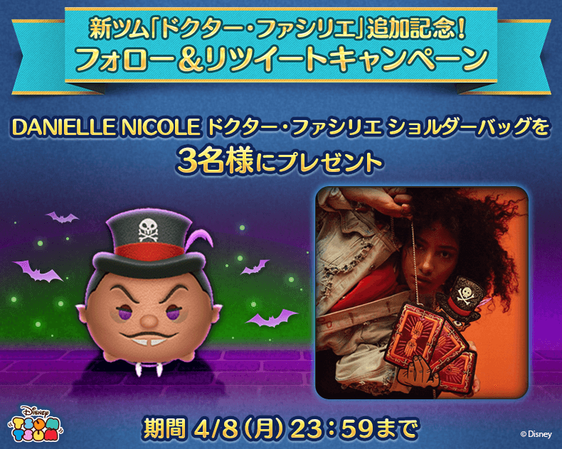 LINE:ディズニー ツムツム公式 on X: "ツムツム春の3大キャンペーン第一弾! 今回はヴィランズの新ツム追加記念でドクター・ファシリエグッズをプレゼント!フォロー&RTであなたもキャンペーンに参加しよう!期間は4 8 23:59まで! 詳細⇒https:t.co w5UZIo23ZS。