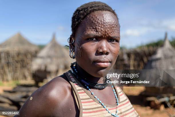BOYA TRIBE,南スーダン-2020年3月10日:南スーダンの部族集落でカメラを見る儀式的なピアスと傷の修正と伝統的なカラフルな服やアクセサリーの女性 —ストック編集用写真©klublub 376846196。