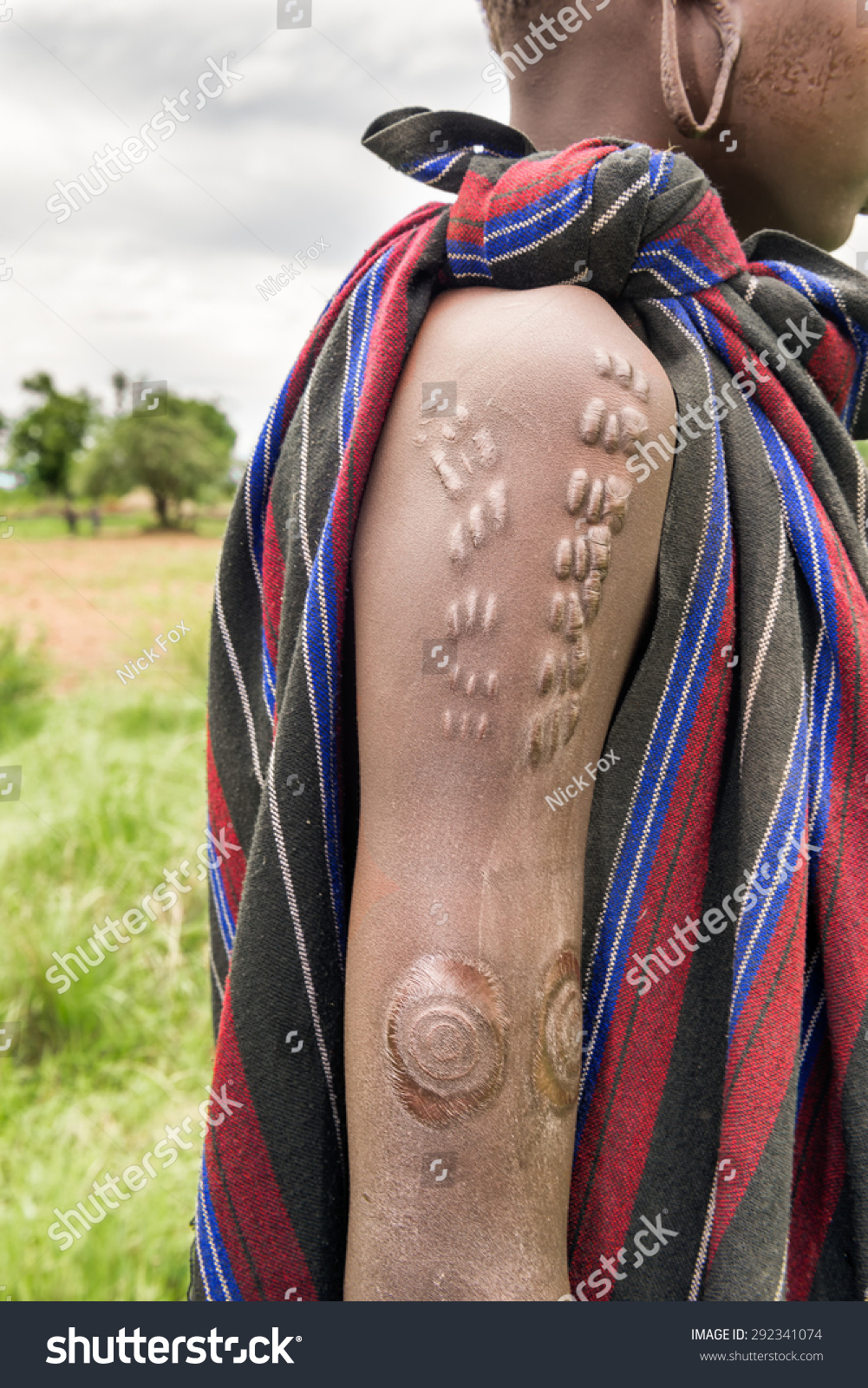 エチオピアのムルシ族に典型的な伝統的なスカリフィ化写真素材292341074Shutterstock。