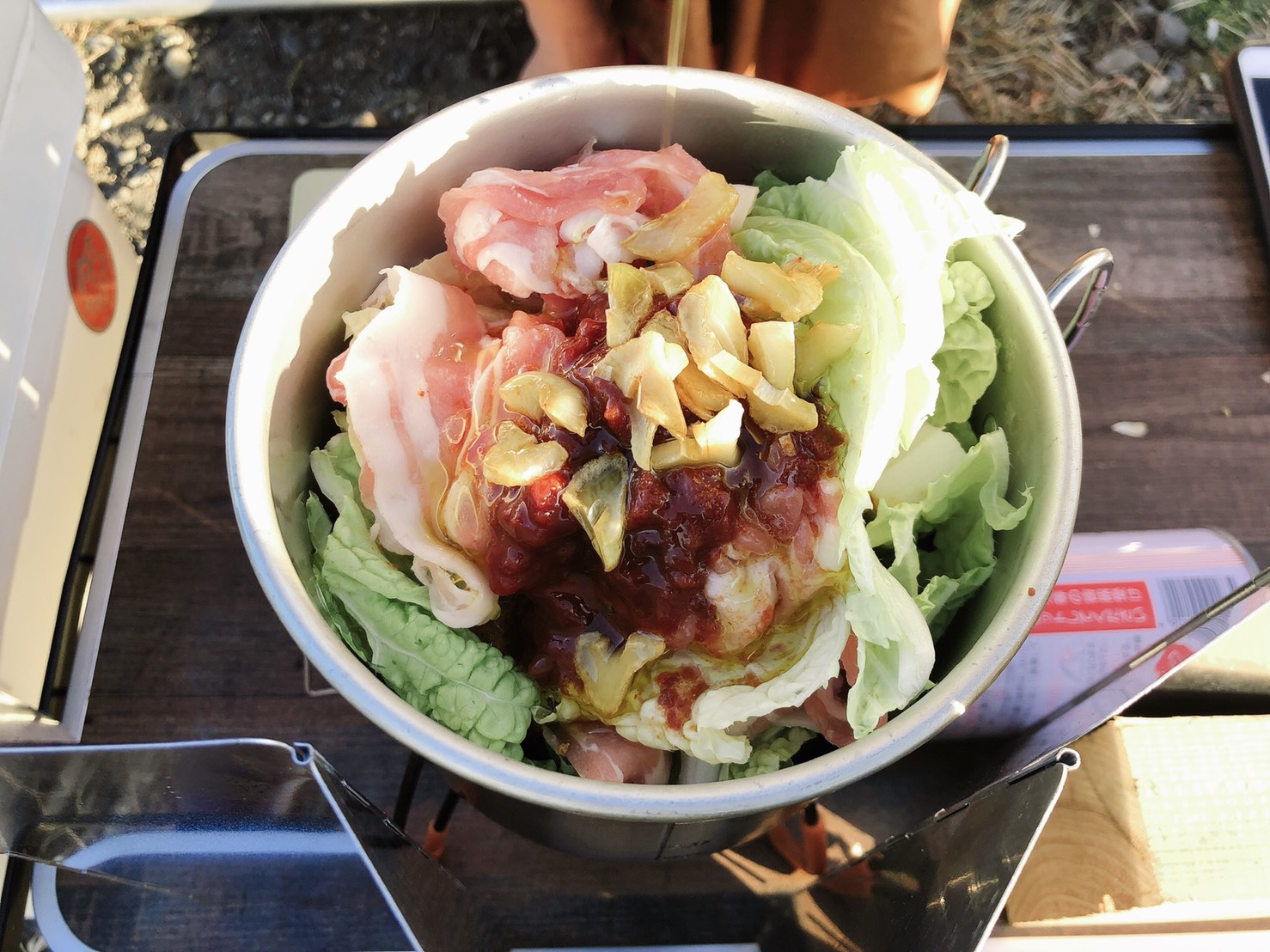 豚と水菜のやみつき無水鍋 山フライパン キャンプごはん。