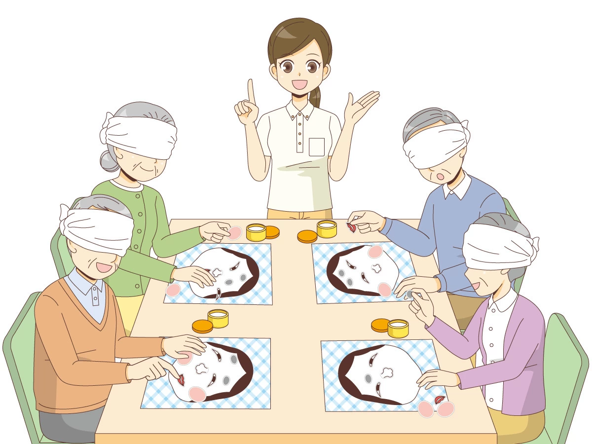 福笑いを楽しむ高齢者 レク・イベント 介護・生活 の無料イラスト介護アンテナ。