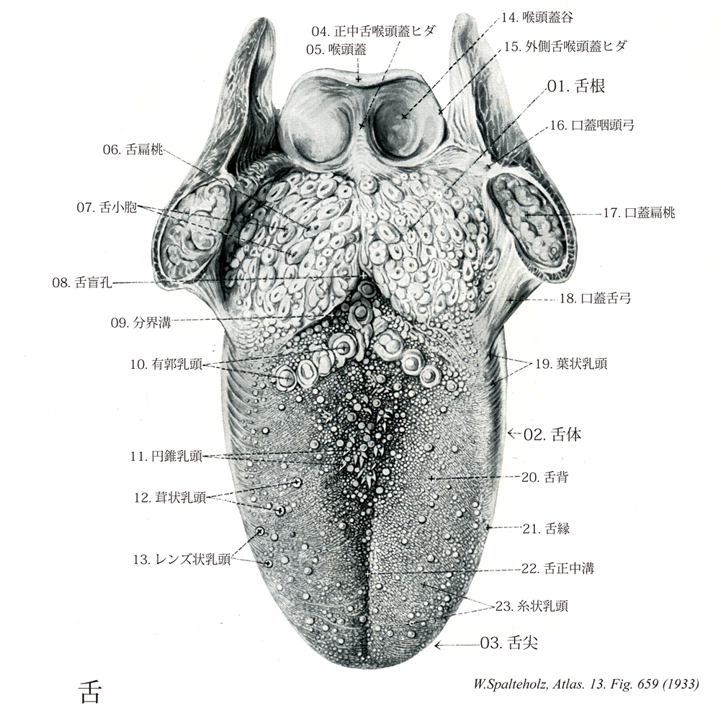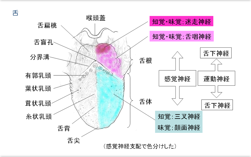 哲郎 on X: "@shirayuki0847pi 分界溝より前が舌体で、奥が舌根。 味覚を伝えるのは、舌体が顔面神経で、舌根が舌咽神経。 でも、分界 溝より奥って味蕾を持つ乳頭が無いじゃん!! 何の味覚を伝えるんだよ!! って疑問が湧いたので、解決してください。 https:t.co。