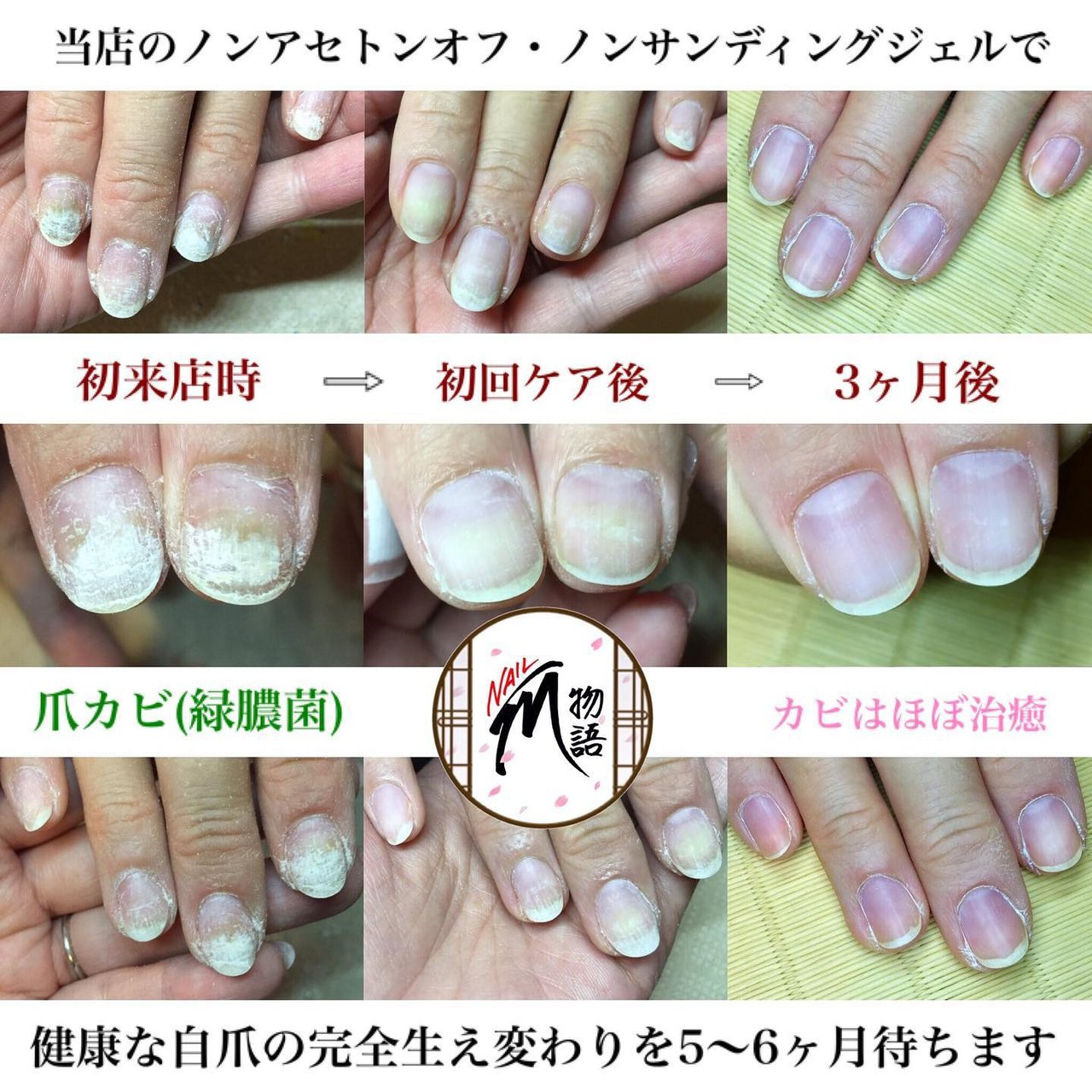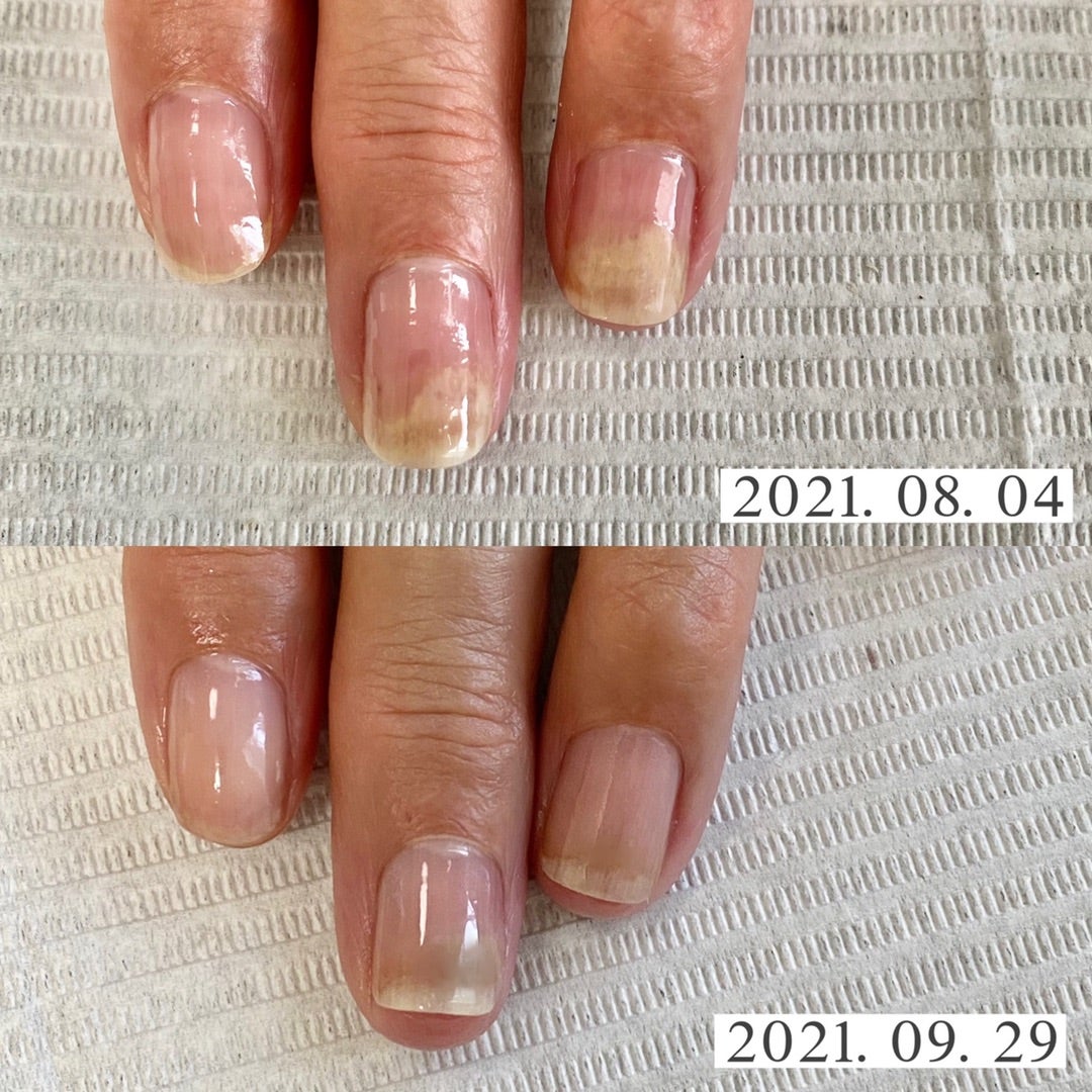 爪が生え変わるのに、個人差や季節の違いはありますが6ヶ月〜1年! 自爪育成はこれから生えてくる爪を健康に生えてくるようにアプローチしていくので、6ヶ月〜1年通っていただくことをオススメします。1ヶ月では約3mm伸びます。 なので、サロンに通う周期でも変化を実感。